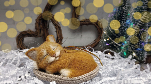 Кто-то украшает новогоднюю елку натуральными котами, а кто-то предпочитает игрушечных. От последних практически нет разрушений, если, конечно, они не являются предметом охоты домашних питомцев. Изначально планировала сделать лежанку, чтобы подвес не затрагивал кота, его можно было снять и переместить спать в другое уютное местечко, но гармонии в равновесии достичь удавалось с трудом, поэтому решила навсегда скрыть розовые подушечки на лапках кота от желающих их потрогать и пришить рыжего. С пряжей...