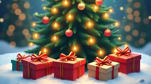 Красиво украшенная ёлка с гирляндами и звездой на фоне уютного зимнего пейзажа. На переднем плане — красочный дождь из подарочных коробок, создающий радостную и волшебную атмосферу. Волшебная зимняя сцена с богато украшенной ёлкой, в окружении падающих подарочных коробок. Праздничная цветовая гамма, динамичная. Промт - Christmas poster showing a beautiful, richly decorated Christmas tree with lights, ornaments, and a glowing star on top...