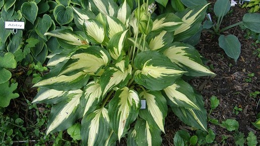 Хоста Christmas Candy - Листовая пластина плотная, появляется из земли шартрезной, затем становится цвета слоновой кости, с широкой неравномерной темно-зеленой каймой, с произвольными шартрезными полосами,...