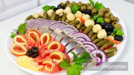 Ассорти из рыбы, солений и грибочков всегда находят особое место на праздничном столе! Такая оригинальная подача украсит любой праздничный стол! Пошаговый видео рецепт можно посмотреть в конце! Для тарелочки ассорти, Вам понадобится: Маслины 120г Оливки 120г Грибы маринованные 350 г (шампиньоны) Огурцы маринованные 250г Лук 1 шт Сельдь 125г Сёмга малосольная 150г (или форель) Лимон 0,5 шт Петрушка Возьмите тарелку для подачи закусок овальной формы (размер 30х25см) или круглую диаметром 25-30 см...