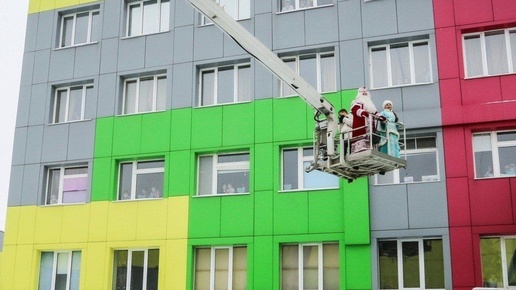 В Липецке Дед Мороз и Снегурочка поднялись на автовышке к окнам детской больницы