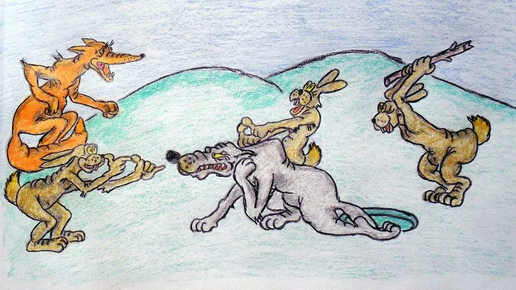Заяц идет по лесу, видит под елкой сидит лиса и плачет. Заяц подходит и спрашивает: - Лисонька, ты чего сидишь плачешь, что случилось? Лиса рыдает и сквозь слезы отвечает: - Волк меня побил, Заинька. Заяц говорит: - Пойдем Лисонька, волка поругаю. Лиса посмотрела на зайца, но встала и пошла показывать дорогу к волку. Пришли они и заяц говорит: - Ты почто Серый обидел Лисоньку? А ну объясняйся! Волк: - Заяц, ты чего билинов объелся? Молись, сейчас съем тебя...