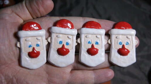 Дед Мороз красный нос – простая вещь, магнит. Его форму слепил из пластилина и снял с её гипсовую форму. Подправив и высушив её, сделал несколько копий «Дедушки» из светложгущейся глины МКФ-2. Одно изделие перед утельным обжигом покрыл глазурью на «по сырому», очень хотелось посмотреть лягут ли мои глазури на сырой черепок этого вида глины. Как оказалось, не лягут )). Это хорошо, что сделал пробу. Что из себя представляет белая глазурь я так и не понял, покупал набор глазурей на 1000-1000 градусов, все отлично плавятся уже на 1020 градусов, а вот конкретно эта, не хочет и на 1070...