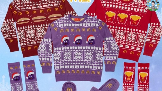 Сеть ресторанов McDonald's представила коллекцию праздничного мерча, которая идеально подходит для зимнего сезона. В линейке представлены оригинальные и забавные вещи: уютные «уродливые» свитера с картошкой фри, МакРибом и Гримасом, зимние носки, мягкие тапки в виде наггетсов, обёрточная бумага с логотипом сети и чулки для подарков, стилизованные под куриные наггетсы...