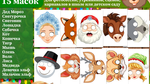 Новогодние маски для детей (комплект 15 масок). Детские новогодние маски подойдут для фотосессии, утренника, карнавала, маскарада, театральных сценок в школе или детском саду. Создайте настоящий праздник с новогодними масками для детей — яркими, весёлыми и простыми в использовании. Этот комплект превратит любого ребёнка в героя зимней сказки: пусть он станет Дедом Морозом, Снегурочкой, Снеговиком или хитрой Лисой из леса...