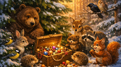 - Бабушка, - спросил тогда Егор — а как под елкой стали появляться подарки? Про наряд для елки ты нам рассказала, а как там стали появляться подарки? Или — тут Егор хитро прищурился — ты и сама не знаешь? - Ну почему же, знаю — улыбнулась бабушка — и сейчас вам расскажу. И Егор с Настей приготовились слушать. - Это было еще до того, как уже знакомая вам елочка получила свой наряд. Перед тем, как впасть в спячку, шел по лесу медведь. Он был очень спокойный и добрый, и все звери его очень любили. И вот, проходил он мимо елочки, увидел ее, и решил как-то ей помочь...