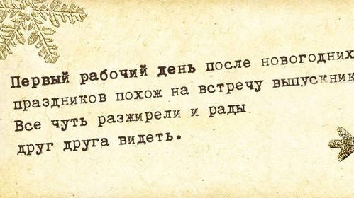 Ну как вы там, ещё отмечаете? А ведь, между тем, многие люди уже вышли на работу и продолжают приносить пользу обществу. Да, да. Посмотрите в окно. Транспорт ходит? Магазины открыты? А это значит только одно - кто-то несчастный, доев по-быстрому все салаты, трудится, чтобы сделать вашу жизнь комфортной. Впрочем, осталось совсем немного и уже совсем скоро каждый окунётся в этот жуткий "первый рабочий день после новогодних каникул". Потому что работать ой, как не хочется, а хочется неспеша проснуться,...