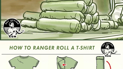 В обзорах на комплекты снаряжения американских военных в трёхдневных рюкзаках можно заметить характерные "скатки" с формой, термобельём и прочим, вплоть до носков. В таком формате одежда занимает меньше места и хорошо ложиться в гермо-мешки для защиты от влаги, а всё помещается в рюкзаки относительно небольшого объёма. Как они это делают? Итак, начинаем с футболки. Разложив на ровной поверхности делаем внизу отворот на 10см. Складываем с одной стороны до противоположного конца горла, а рукав отворачиваем наружу...