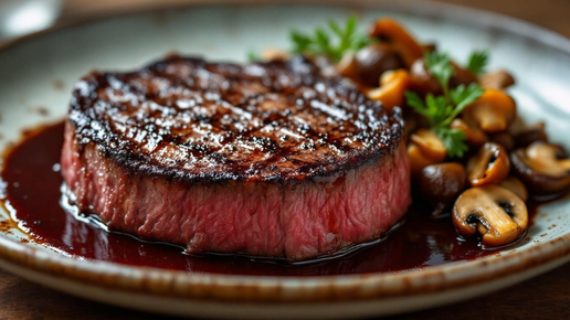 Филе миньон с красным вином и грибами — идеально прожаренный стейк с соусом на основе красного вина и лесных грибов.