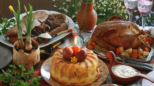 Застолье на Пасху практически в любом доме ломится от угощений. Каждая хозяйка, даже если семья не держала строгий пост, все равно стремится приготовить много разнообразных кушаний. На стол ставится все, что нельзя было употреблять целых 40 дней. Обязательно появляются молочные, яичные, мясные, сдобные и рыбные блюда. Из поколения в поколение передаются пасхальные рецепты. Помимо творожной Царской и сдобной пасочек в каждом доме будут великолепные разноцветные яички, крашеные во все цвета радуги и самыми разными способами...