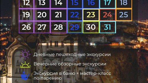 ! Публикуем календарь наших туров и экскурсий на месяц 🍇 8 января - «Новогодние настроение». Экскурсия по вечернему городу и дегустация вин винодельни Михаила Колесникова, улиток и закусок в кафе «Лалита» 🥣 9 января - «Вечер огней и вкусов». Вечерняя экскурсия и новогодний ужин в кафе «Компот» 💨 11 января - экскурсия в «Баню №1». Погружение в банные традиции, мастер-класс по изготовлению скраба и чаепитие из самовара 💨 15 января - экскурсия в «Баню №1». Погружение в банные традиции, мастер-класс...