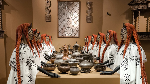 Выставка в ГИМ, Красная площадь, 1. А потом на каток и в ГУМ. Главное, не перепутать буквы, засмотревшись на сказочный мир от Алёны Ахмадулиной. Название материала в шутку. Просто захотелось показать вам эту инсталляцию подробнее. Одинаковые девушки за столом в "светлице", на столе настоящая историческая посуда. Волосы у девушек заплетены в бесконечные длинные косы, переплетенные между собой...