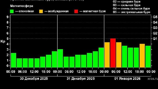 Расчеты подтверждают, что в ночь с 31 декабря на 1 января на Земле прогнозируются магнитные бури. Непосредственно в праздник на территории страны ожидаются яркие полярные сияния. На указанный период приходится совпадение сразу двух факторов: воздействия от небольшой корональной дыры на Солнце и прихода к Земле края плазменного облака, выброшенного со звезды после серии вспышек. По прогнозу, мощность магнитной бури достигнет первого уровня из пяти возможных. Высокие шансы полярных сияний будут в северных и северо-западных регионах страны, в том числе в Санкт-Петербурге...
