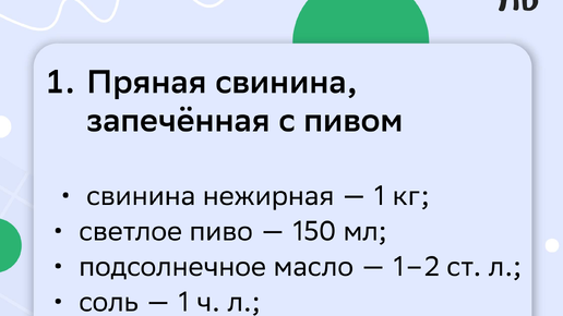 Друзья, Новый год — это отличный повод порадовать близких вкусными и необычными блюдами. Мы собрали для вас три оригинальных рецепта, которые украсят ваш праздничный стол и подарят настроение уюта и тепла. ✨ Список ингредиентов вы найдёте на карточках, а подробный способ приготовления — ниже. Готовьте с удовольствием и удивляйте гостей! 🍴🎉 Пряная свинина, запечённая с пивом 1️. Свинину вымойте, обсушите салфеткой. Если есть жировая прослойка, нарежьте её квадратами. 2️. Свинину натрите солью, перцем, добавьте семена тмина и тимьян...