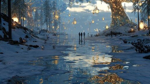 A surreal and majestic New Year dreamscape, a giant translucent crystal Christmas tree floating slightly above a snowy frozen lake, roots