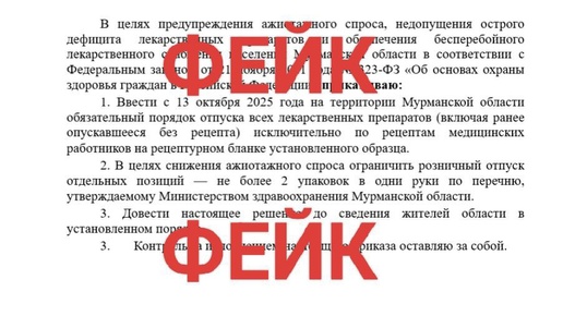 ⚡️В социальных сетях распространяется поддельный приказ регионального Минздрава, в котором говорится о том, что якобы с 13 октября 2025 года все лекарства в регионе будут продавать только по рецептам. Это – фейк, сообщает региональный оперштаб...