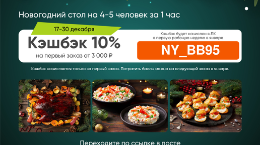 в Elementaree до 30 декабря действует кэшбэк* 10% за первый заказ при заказе блюд из Новогоднего меню от 3000 ₽ по промокоду** NY_BB95