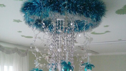 Интересное предложение - новогодний мобиль. А, что такое мобиль могут спросить некоторые - это подвижная конструкция из подвешенных элементов, размещающаяся в основном под потолком. Кстати это отличное решение для тех у кого есть подвижные домашние питомцы и поставить елку проблематично, а вот сделать такой подвесной новогодний мобиль вполне реально. Главное найти только такое место, где можно разместить эту конструкцию. Хотя люстра тоже прекрасно подойдет))) Мягкие свет от ламп будет подсвечивать мобиль и создавать праздничную атмосферу...