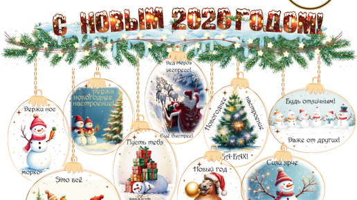 Весёлое новогоднее оформление с забавными изображениями и шуточными фразами.