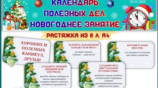 В рамках подготовки к занятию «Разговоры о важном» 29.12.2025 для 1-5 классов разработано три тематических комплекта материалов с разным дизайном для скачивания, печати и оформления школьной доски или кабинета перед проведением классного часа. Все шаблоны адаптированы для печати в цветном или экономном чёрно-белом режиме на стандартной бумаге А4...