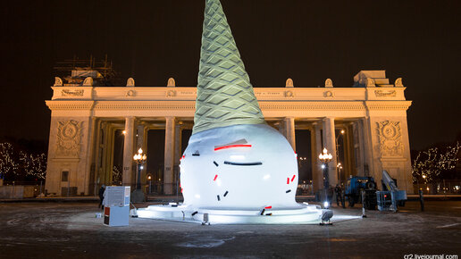 У входа в знаменитый Парк Горького в Москве каждый год к новогодним праздникам появляется необычная ёлка. Точнее появлялась, поскольку в этом году (и вроде бы в прошлом тоже) там стоит вместо ёлки большой светящийся шар)...