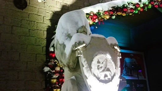 Новогодняя ярмарка в районе Щукино находится у ТЦ Щука и станции метро Щукинская. Шел сильный снег, отсюда и дефекты на фото. Нас просто заметало мокрым снегом! Вход на ярмарку тут охраняют грифоны. Грозные крылатые создания. Но внутри опять львы, но со щитами, почти занесенные снегом...