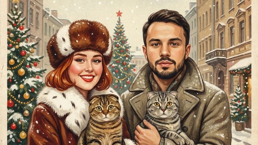 Трендовый промпт для создания новогодних открыток на основе ваших фото. Потестил Nano Banana и GPT Image. В GPT получили менее похожие персонажи, но приятно добавлена текстура старины и открытка имеет приятный старинный вайб (второе фото). У Нано Банана получилось лучше передать лица. Делал на основе 4х разных фото, если использовать цельную фотографию результат будет лучше. Промпт: Винтажная советская новогодняя открытка 1950-х годов, традиционная иллюстрация гуашью или акварелью. Лица людей...