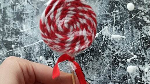 Уже украсили дом к Новому году? Я знаю что может внести изюминку в ваш интерьер - декоративная карамель на палочке! Такую карамель можно использовать как для украшения, так и для фото. Она оооочень похожа на настоящую (Небольшая пушистость её всё-таки выдаёт). Для изготовления такой конфеты, мне понадобились: - Нитки для вязания двух цветов; - Картон; - Деревянная палочка; - Клей...