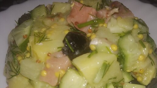 Доброго дня, дорогой читатель!!! Скоро Новый год,и, наверное, каждая хозяюшка ищет новые рецепты, чтобы порадовать своих родных и близких, вот и я не исключение. Этот салат отлично подойдёт для такого праздника, он вкусный и достаточно лёгкий, с пикантной кислинкой. Что потребуется Все как всегда просто. Необходимо нарезать все продукты. Маслины режу на половинки. Картофель, филе солёной горбуши (кости все тщательно убрать), огурцы режу кубиком. Укроп нарубить. Все складываю в салатник Теперь готовлю заправку...