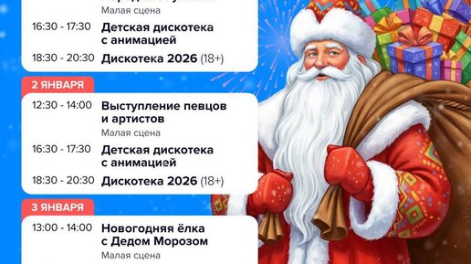 🎅 Окунитесь в настоящую зимнюю сказку! Вас ждут анимационные программы, весёлые народные гуляния, дискотеки, выступления певцов и артистов. 🌲 А ещё — катание на ватрушках и снегоходах, мастер-классы и, конечно, новогодняя ёлка с Дедом Морозом...