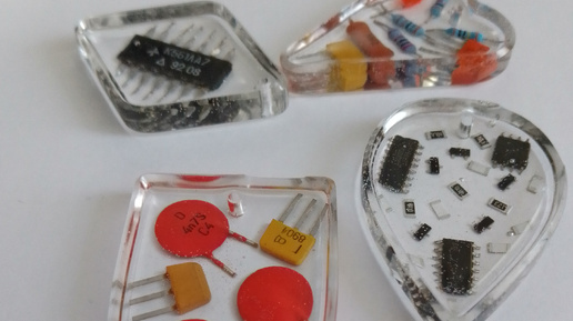 вот такие и у меня получились брелки для электронщиков ! но не все так просто оказалось и нужен в этом деле навык ! заливал я разные запчасти чтобы проверить как все будет смотреться но не учел наполнения заливки и у меня получилось не до залито немного верх . но как говорят научимся ))) а получилась все равно классно. заливал и смд радиодетали и простые . да есть немного пузырьки не критично как их убрать так и не понял . замуровали их на век ))) с цветными деталями очень эффектно получилось надо пробовать еще что нибуть заливать ...