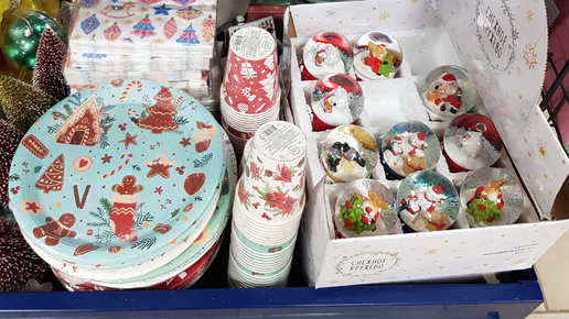 Здравствуйте, дорогие друзья! Решила сегодня начать свой обзор с новогодних товаров, тех,, которые ещё не показывала. Сувенир новогодний "Волшебный шар" - 199 рублей. Диаметр: 6,5 см. Состав: полирезин, стекло, вода, пропиленгликоль. Хорошая задумка эти стеклянные шары, но фигурки такие аляповатые, что портится весь вид. Если перевернуть шар, то вот так всё заискрится. Набор бумажных тарелок, 8 штук - 87 рублей. Состав: ламинированный картон. И есть в продаже Набор бумажных стаканчиков, 8 штук - 87 рублей...