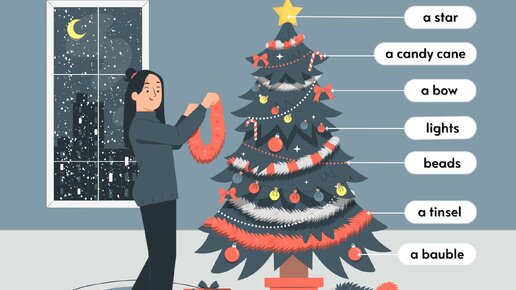 Новогодняя ёлка — главный атрибут Нового года и Рождества. Каждый год около неё происходят чудеса, собираются родные и близкие, и конечно же, находятся подарки. English stuff подготовил список полезных слов и фраз по теме "Let's decorate the Christmas tree!". Christmas trees: • a real tree — живая ёлка • an artificial tree — искусственная ёлка • a pre-lit Christmas tree — искусственная ёлка cо встроенной гирляндой Phrases: • to fluff an artificial tree — распушить искусственную елку • to shape branches...