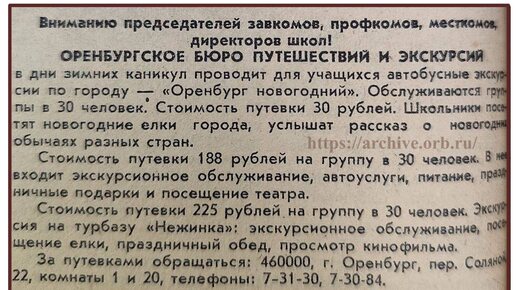 Как рассказывает газета «Южный Урал», в начале 1980‑х Оренбургское бюро путешествий и экскурсий организовывало для школьников увлекательные поездки. Ребята отправлялись в путешествия по самым интересным местам: ездили в Среднюю Азию, Украину, Прибалтику, города Поволжья и на черноморское побережье.