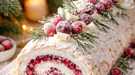 Снежная Молния: Новогодний меренговый рулет с клюквой и облачным кремом — тот самый десерт, который выглядит на миллион.