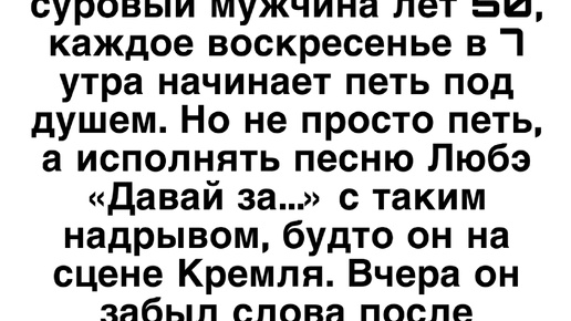 1. Соседский перфоманс Мой сосед сверху, суровый мужчина лет 50, каждое воскресенье в 7 утра начинает петь под душем. Но не просто петь, а исполнять песню Любэ «Давай за...» с таким надрывом, будто он на сцене Кремля. Вчера он забыл слова после первого куплета и минут пять мычал одну и ту же мелодию. Я внизу пил чай и аплодировал. 2. Детектив в супермаркете Видела, как малыш лет четырёх устроил истерику у кассы, требуя шоколадку. Мама, недолго думая, достала из сумки лупу (для чтения ценников)...