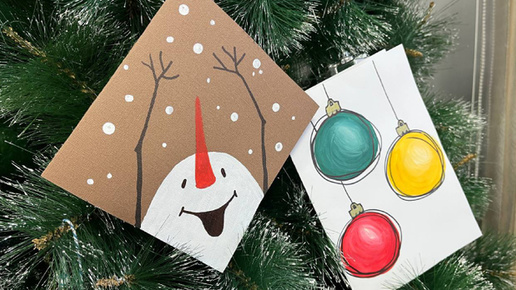 Как нарисовать новогоднюю открытку? Сделайте открытку своими руками вместе с детьми. Быстро, просто и красиво! Понадобится: крафтовый картон или плотная бумага для скрапбукинга 15х30 см, белая акриловая краска, оранжевая акриловая краска (или красный+желтый), кисточка, черный маркер или фломастер. Всё просто. Картон складываем, в углу рисуем полукруг белой крской. Акриловая краска сохнет быстро - 5-10 минут. Высыхает - рисуем морковку, высохло - рисуем глазки и улыбку, ручки-палочки. Берем ватную палочку, кончик обмакиваем в белую краску и рисуем снежок...