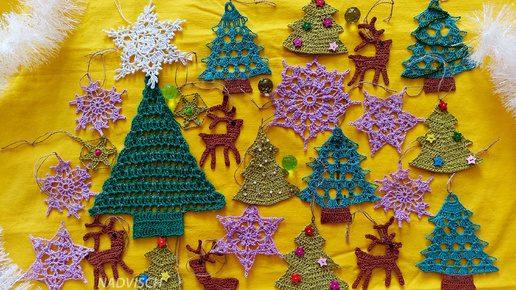 Новогодние вязаные игрушки и снежинки. Ёлочки крючком. Плоский оленёнок крючком.