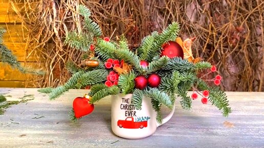 НОВОГОДНЯЯ КОМПОЗИЦИЯ В КРУЖКЕ из еловых веток. ПОДАРОК на праздники своими руками.