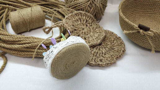 Друзья, присмотритесь к джуту, это натуральный материал и полностью экологичен. Предлагаю идеи из джутовых верёвок разной толщины. 1. Тонкая верёвка. Скрутив её в улитку строчим на машинке прямые линии для закрепки, затем зиг-загом по кругу, формируя блин. Можно приподнять под угол, тогда получатся бортики. Эту заготовку можно использовать как основу под игольницу или подставку под кружку. 2. Из шпагата можно связать мочалки для мытья посуды или для тела. У них широкий спектр применения и разные формы могут быть...