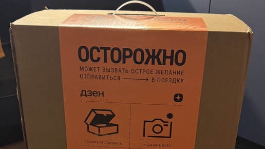 Новогодние праздники закончились. Ёлка загрустила, мандарины кончились, а я уже начала бронировать туры на лето. И тут - звонок. - Это служба доставки, вам посылка. Хм, странно, вроде бы я в последние дни ничего не заказывала на маркетплейсах. Что за посылка? Загадка. Конечно, мне не терпелось поехать и забрать загадочную посылку, несмотря на то, что на улице уральские метели. Приезжаю на пункт выдачи - ого! Какая огромная коробка: И на ней знакомая надпись, по которой я поняла, что посылка от площадки Дзен...