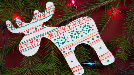 Сегодня рассмотрим пару простых способов сделать декоративные подвески из бумаги для новогодней ёлочки или украшения интерьера. Их можно подвесить в качестве одиночного украшения или создать гирлянду. Точечная роспись. Фигурки лосей. 1. Находим в интернете или рисуем самостоятельно симпатичную фигурку животного. Мы выбрали Лося — есть в нём что-то зимнее, новогоднее и уютное. Распечатываем изображение и делаем трафарет. Затем, пользуясь шаблоном, обводим и вырезаем фигурки из плотного картона.  2...