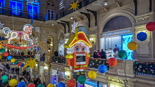 Пингвиньим шагом от Площади Революции через Манежную площадь добрались до Красной площади. Кругом ёлки, украшения, гирлянды, аттракционы, ярмарочные павильоны и много-премного людей. Об этом было в предыдущей публикации (*ссылку оставлю ниже). А сегодня про ГУМ, где не менее красиво! Ещё и тепло... Людей по-прежнему много, на вход очереди, в которых придется провести не менее 10 минут. Напомню, это был выходной декабрьский день. В новогодние каникулы ситуация изменилась не сильно. Попадаем внутрь и оказываемся в самой рождественской сказке -"Щелкунчик"...
