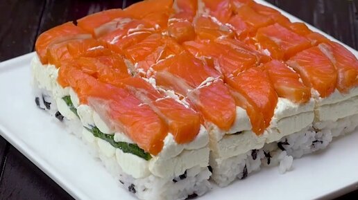 Все ещё не знаете, что подать на праздничный стол в качестве закуски и удивить гостей? Предлагаю очень простой рецепт приготовления суши. За праздничным столом такое блюдо кушать удобнее, так как привычные для роллов приборы - палочки, не потребуются😊 И приготовление займет не больше 15 минут вашего времени, а пока суши-торт будет застывать в холодильнике можно заняться другими, более важными делами😉 Ингредиенты: 200 г слабосолёной красной рыбки 1/4 стакана риса 1 крупный огурец 200 г сливочного сыра 1 лист нори 1 ст...