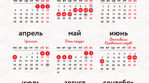 Некоторые государственные праздники, например, Китайский Новый год или Фестиваль Середины Осени, отмечаются по лунному календарю, а значит, каждый год могут выпадать на разные даты...