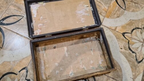 Перевернут Пинтерест,Гугл и Яндекс и ничего подходящего для хранения елочных игрушек не найдено,хочется сказочного,уютного ,чтобы приятно открыть в следующем декабре )))🌲 Для декора выбрала небольшой чемодан 45х35 из советского прошлого. Внутри переклеен флизелиновыми обоями,которые легко снялись ,у одного из замочков сломана пружина,но он рабочий,в остальном все отлично! Чемодан был покрыт золотой краской по углам и фурнитуре, с правой стороны кокетливо красовалась переводная картинка с цветочком...