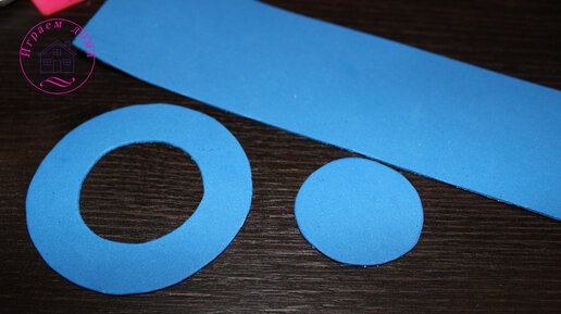 Доброго времени суток. 😉 Сегодня сделаем небольшое дополнение к новогоднему подарку. Из фоамирана вырезаем детали цилиндра. Он у нас ровный. Пробный, так сказать.)) Высоту подстраивали под размеры игрушки. Круги вырезали острым ножом, так удобней. Как только все детали готовы. Приступаем к склеиванию. К предстоящему празднику, подобрали конечно блестящий фоамиран.))Синий! В цвет нового года. Склеиваем длинную ленту. Приклеиваем большой круг. Закрываем донышком...