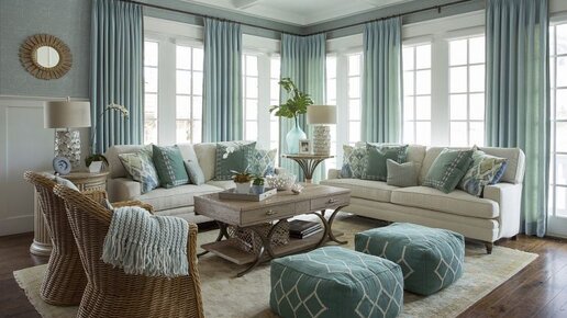 Если вы мечтаете о нежном доме с расслабляющей атмосферой, которая напоминает вам отпускные дни, проведенные около теплого моря, эта интерьерная идея для вас. Акцент на текстуре текстиля, садовой мебели и нежном оттенке бирюзы создает шикарной прибрежный стиль, совсем непохожий на привычный нам средиземноморский. Секрет приятного расслабляющего морского стиля — контраст текстур. Перила и ступеньки лестницы темнее пола; на фоне белых панелей выделяется деревянный комод, цвет которого из-за контраста...