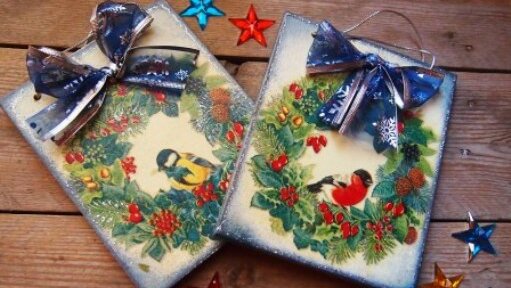 Самый бюджетный способ сделать подарки своими руками, это многим известный декупаж. А ведь действительно, с помощью этой нехитрой техники можно задекорировать даже старые и ненужные предметы. Да и на новый декор много денег не требуется. Например, такие новогодние панно можно сделать на обычных досочках из фанеры. Эта новогодняя пара сделана на обычной разделочной доске и тарелке стоимость которых составила всего сто рублей. Тарелка выполнена в технике обратный декупаж, поэтому ее можно использовать по назначению...