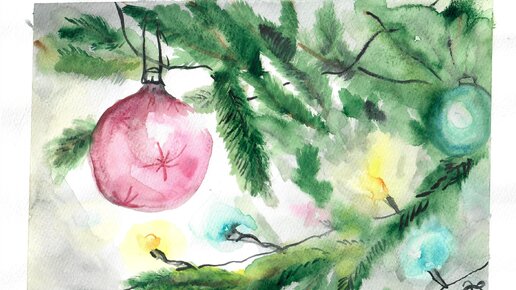 Здравствуй, уважаемый читатель! Новогодняя ёлка - один из главных символов праздника. Сегодня я познакомлю тебя с несложной техникой акварельной живописи - "рисование по мокрому" (об этом подробнее смотри ниже) на примере композиции из веток ели, светодиодной гирлянды и шаров. Что понадобится: Если кратко, то техника по мокрому подразумевает рисование на предварительно смоченном листе бумаги акварелью. А теперь приступим к уроку! Шаг 1. Подготовка к работе. Строительным скотчем обклеим края бумаги так, чтобы получилась рамка...